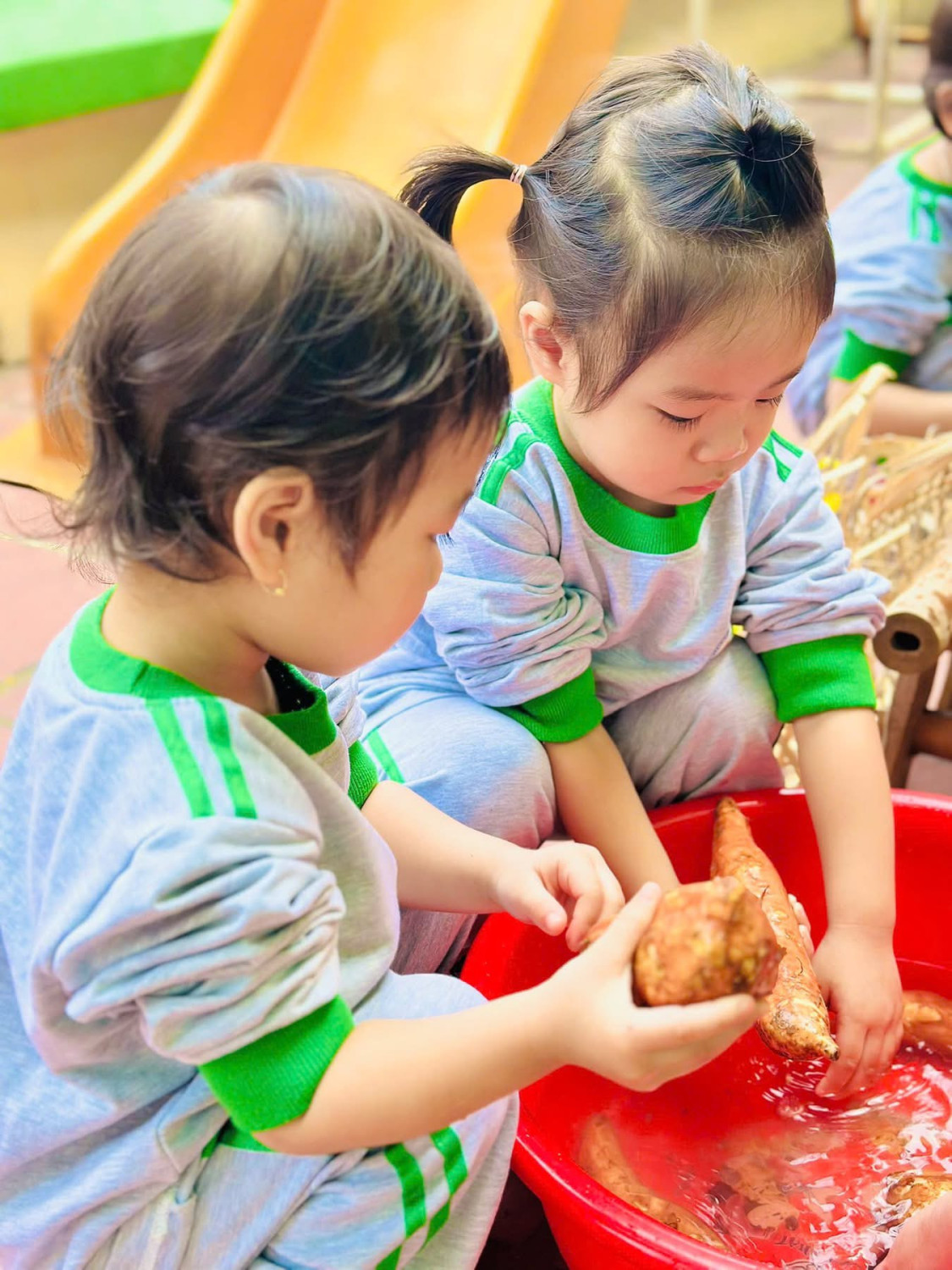 ✨ Tập làm việc nhóm rửa khoai, xếp khoai – cùng nhau chia sẻ, cùng chờ phần khoai chín để mời bạn, mời cô.