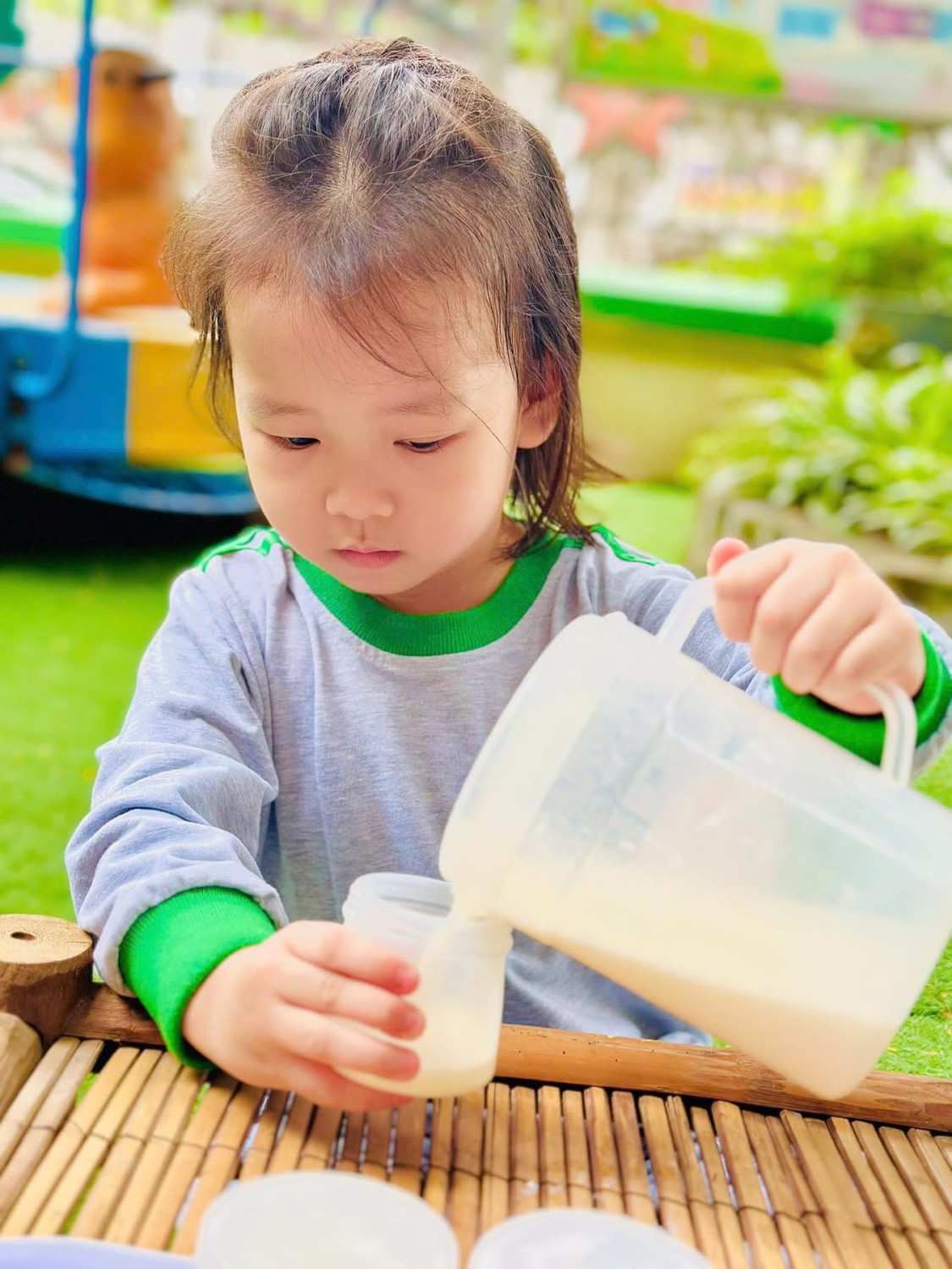 🍼 Bé tự tay khuấy sữa, rót vào những chiếc hũ nhỏ xinh, cẩn thận từng chút một và hồi hộp chờ đợi thành phẩm của riêng mình.