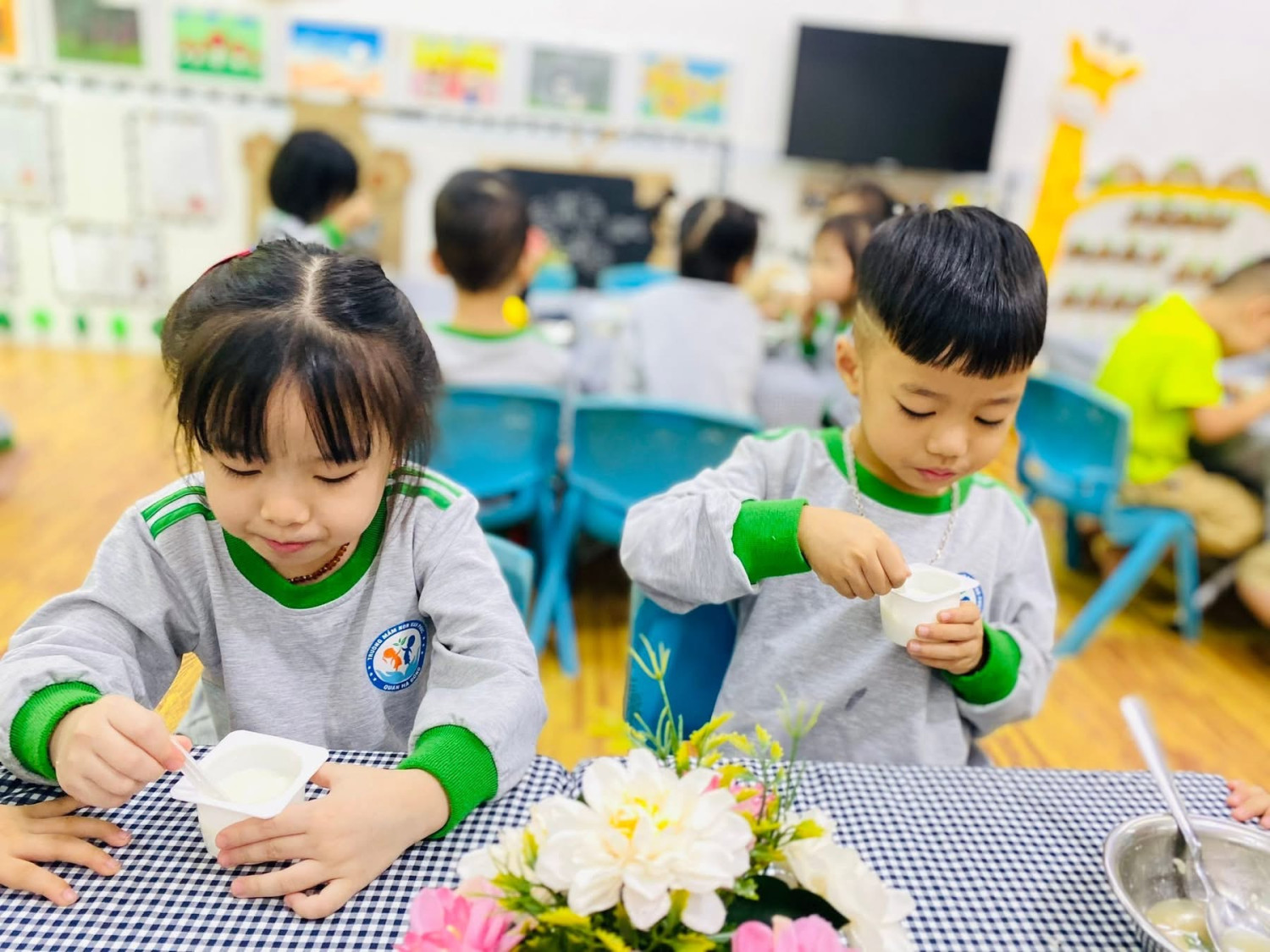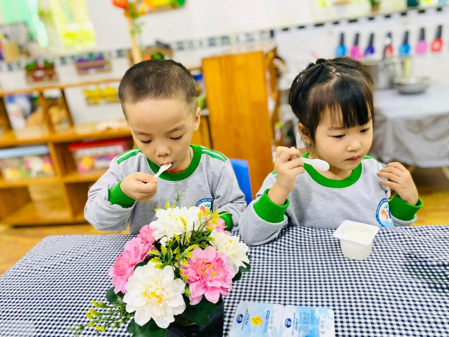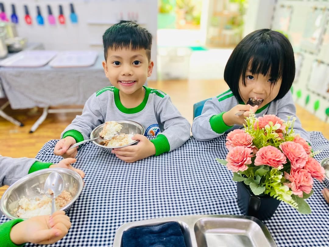 Bé nào cũng tự xúc ăn 🍴, biết mời cô và bạn trước khi ăn 💕.
