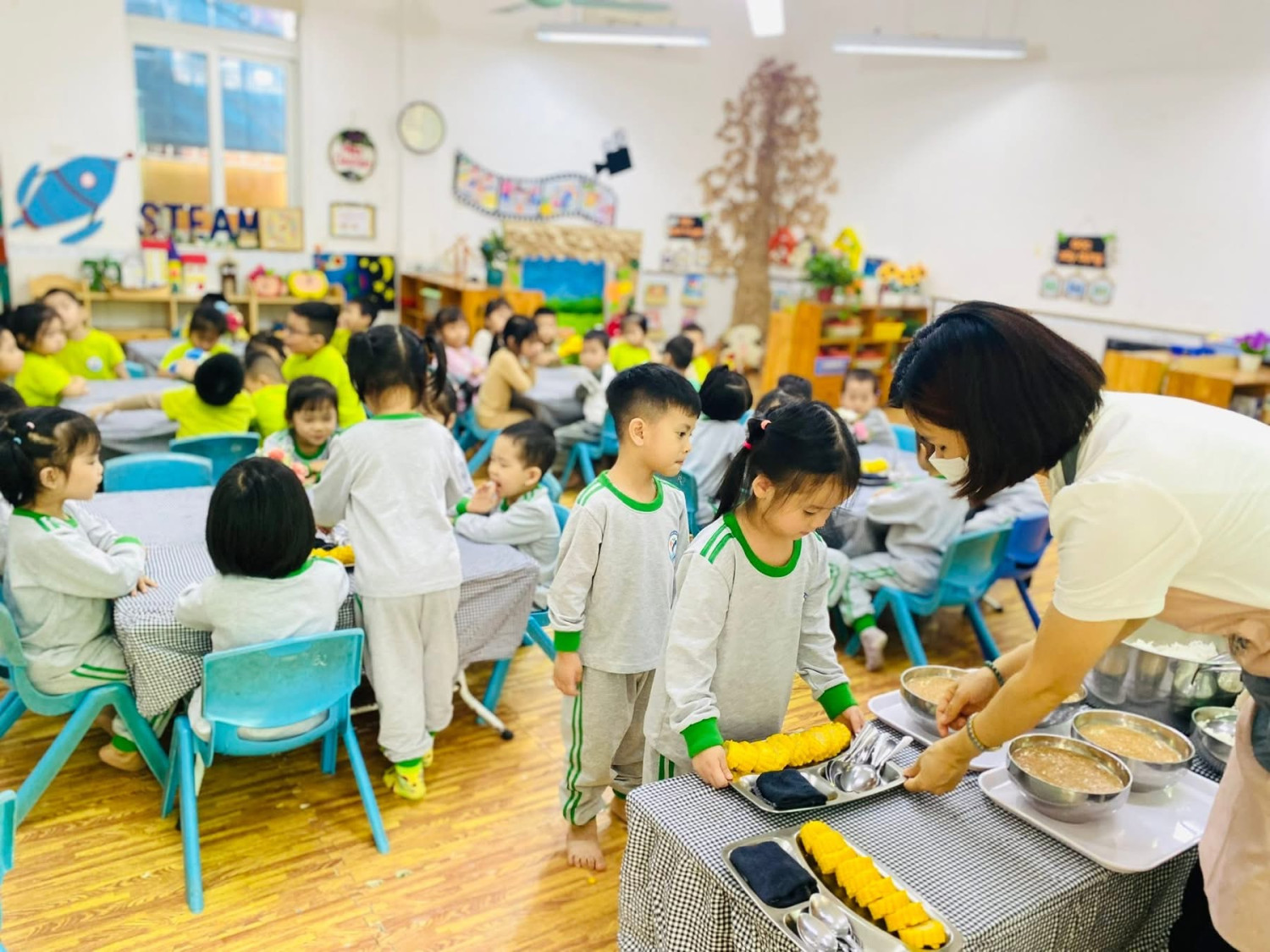 Những bát cơm thơm ngon, nóng hổi 🍲 được cô chia đều cho từng bé.
