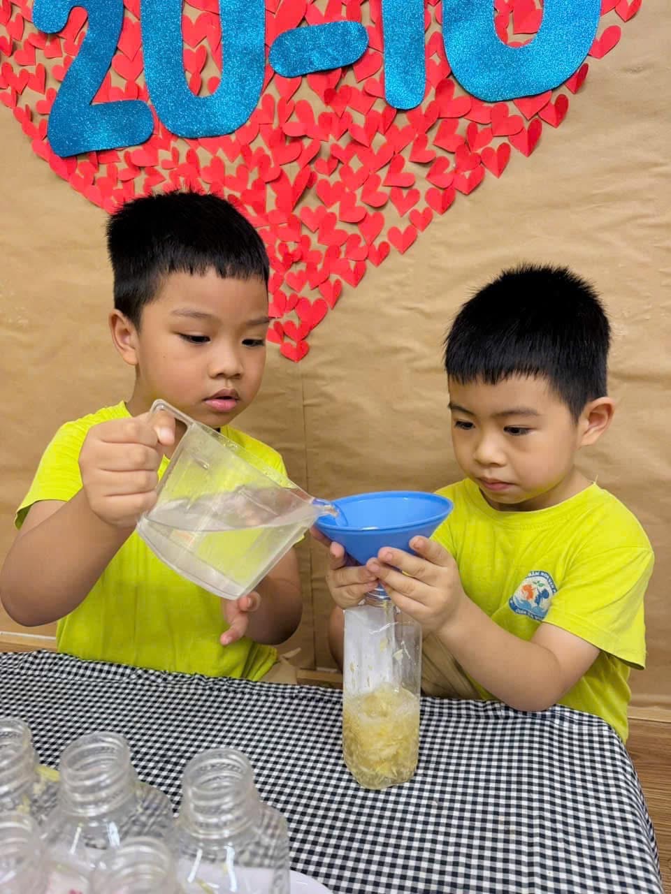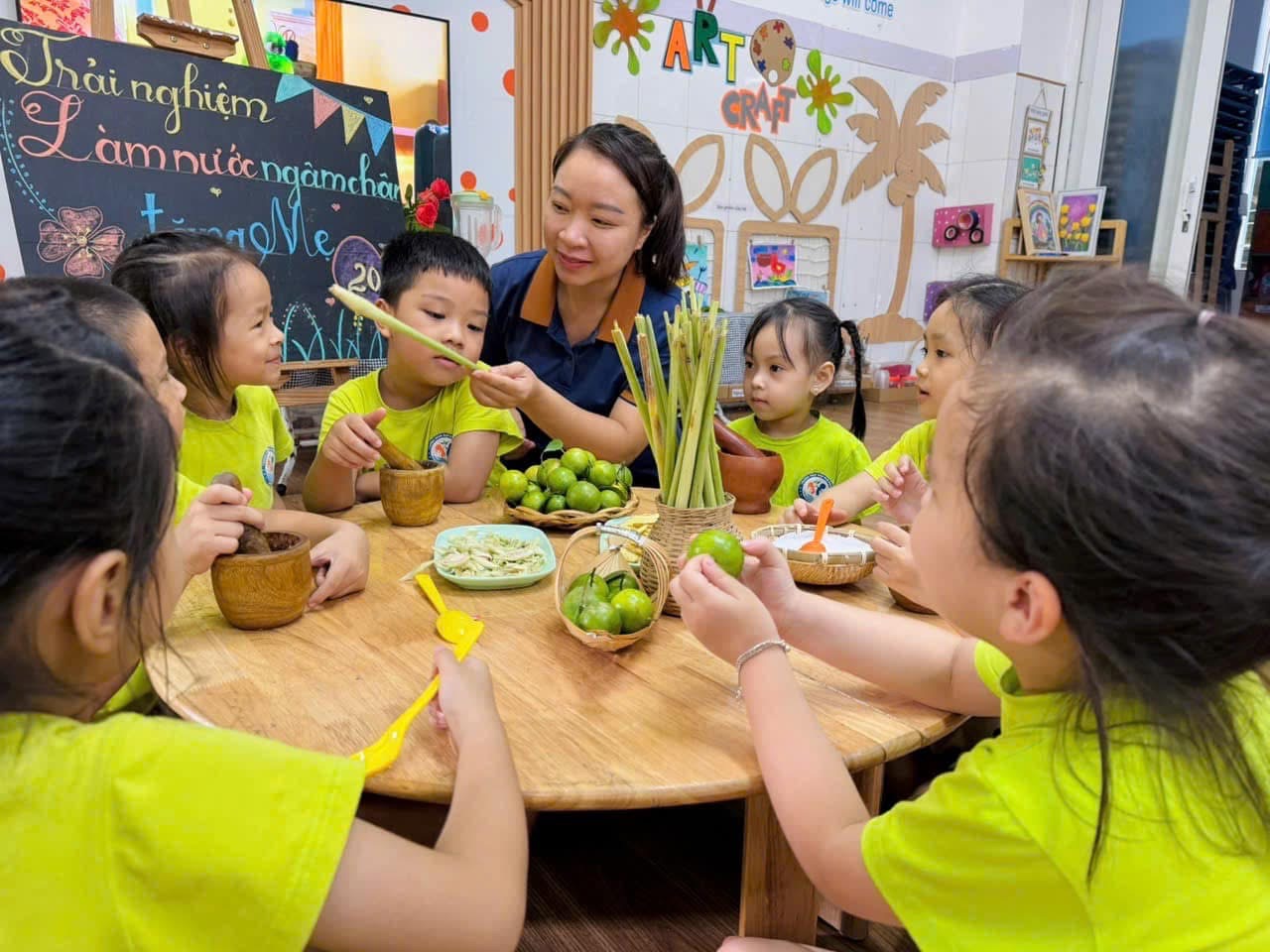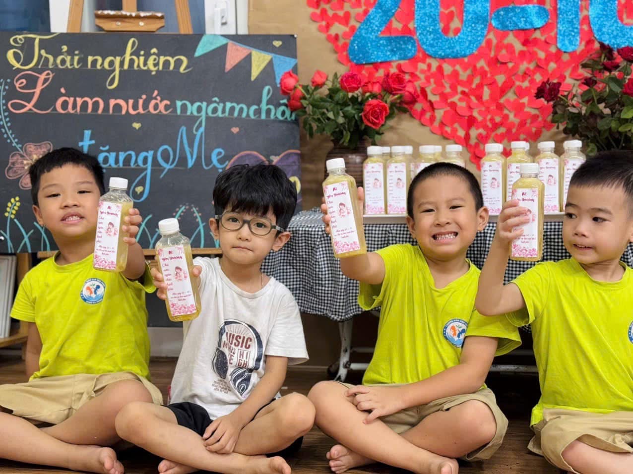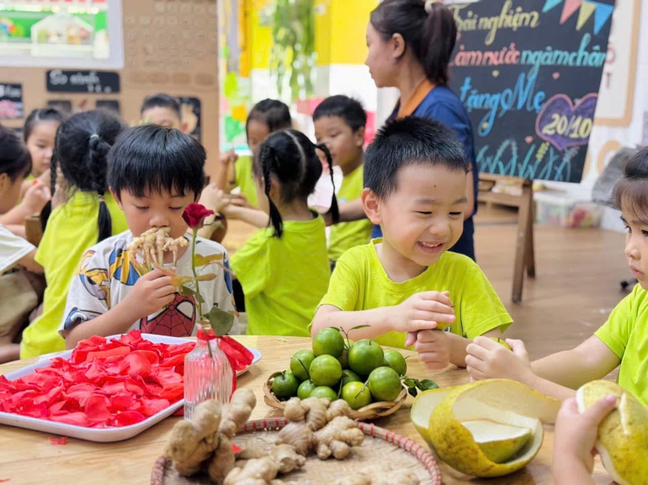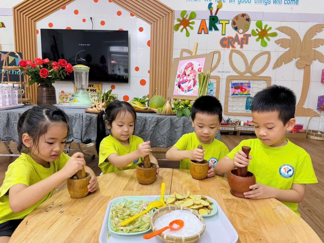 Các con được tìm hiểu về những nguyên liệu hoàn toàn từ thiên nhiên như: gừng, sả, chanh, vỏ bưởi, cánh hoa hồng, muối hột… Dưới sự hướng dẫn của thầy cô, các bạn nhỏ đã cùng nhau rửa – giã – pha chế – và đóng chai nước ngâm chân một cách tỉ mỉ và đầy yêu thương 💧🌿