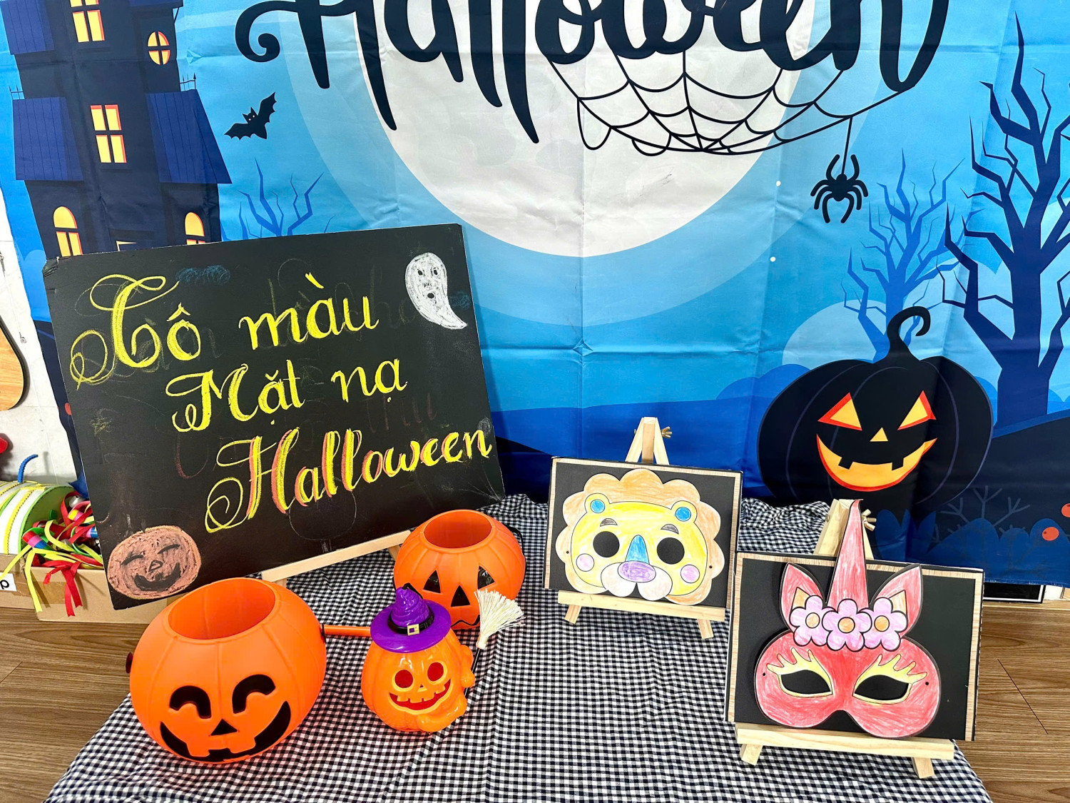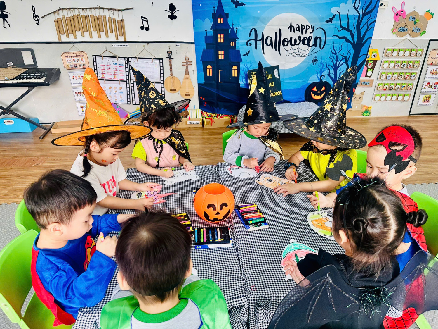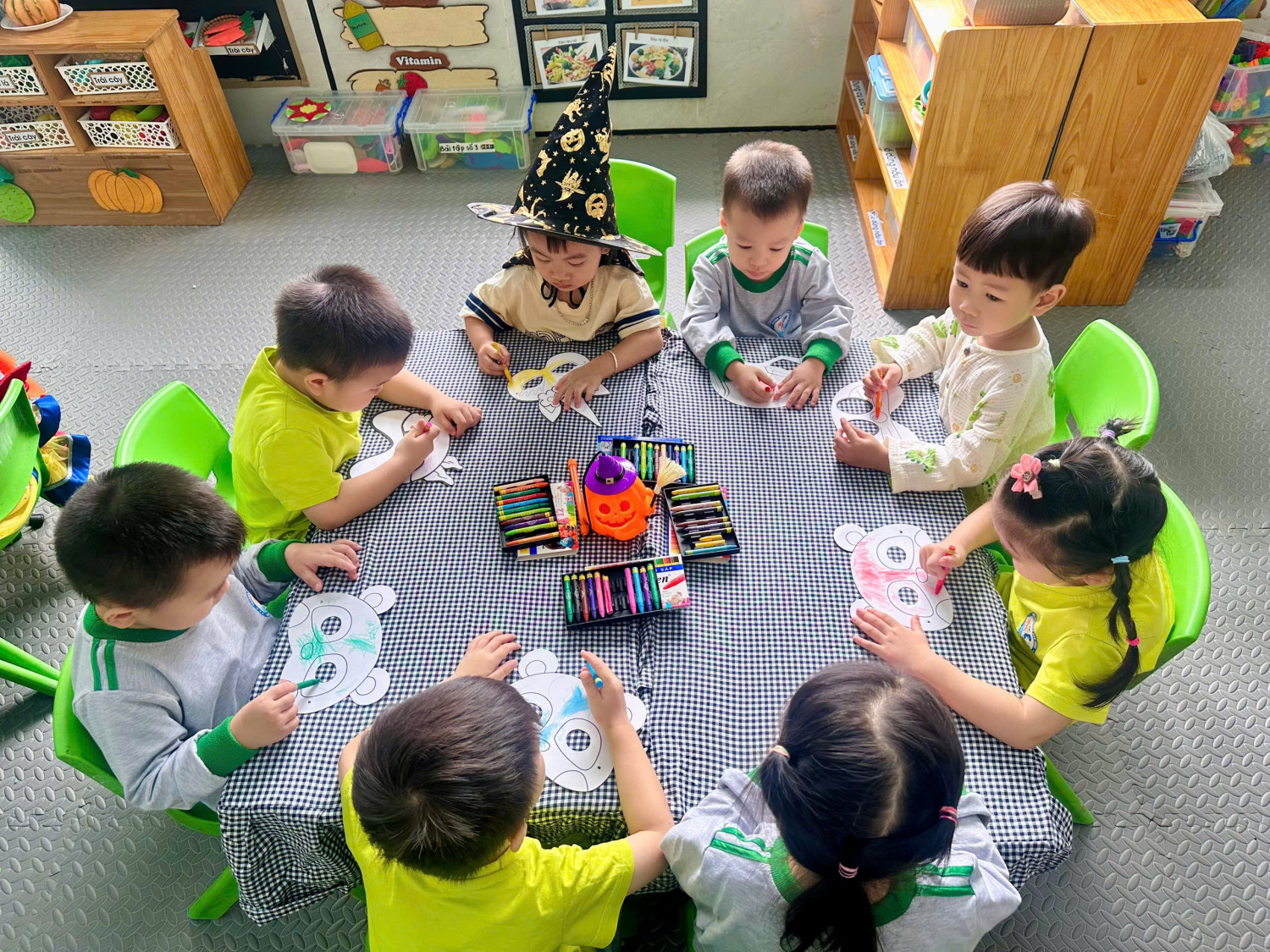 Hoạt động giúp các con rèn luyện sự khéo léo của đôi tay, khả năng phối màu, đồng thời mang đến niềm vui háo hức chuẩn bị cho ngày hội Halloween sắp tới. 👻