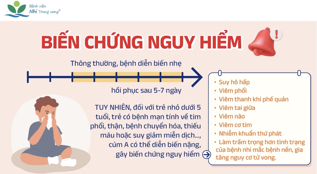 • Bệnh có thể gây ra các biến chứng nghiêm trọng như viêm phổi, suy hô hấp, đặc biệt nguy hiểm với trẻ em, người cao tuổi, phụ nữ mang thai và người có bệnh nền.