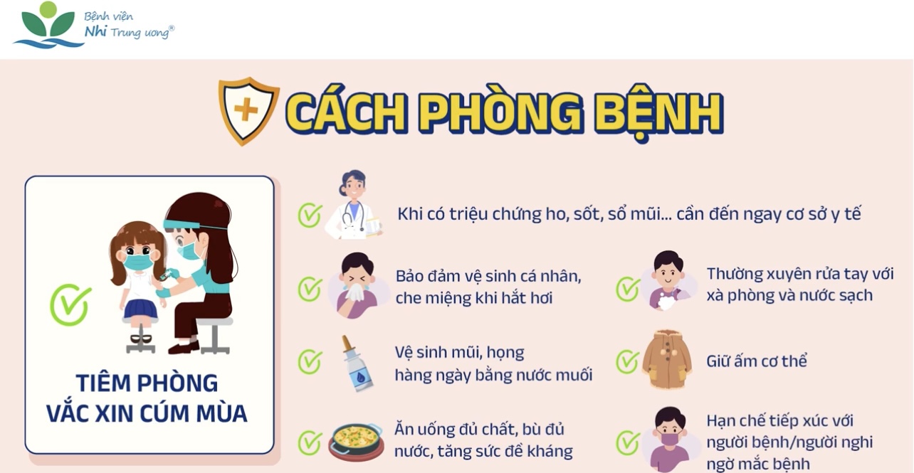 • Tiêm vắc-xin cúm mùa: Đây là cách phòng ngừa tốt nhất. Hãy tiêm định kỳ hàng năm.