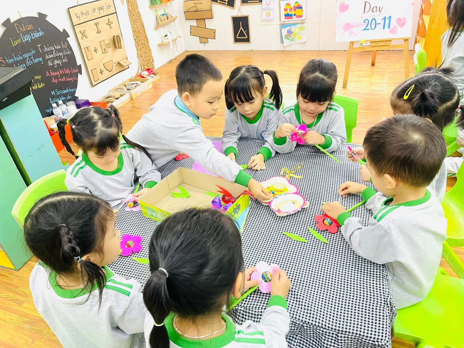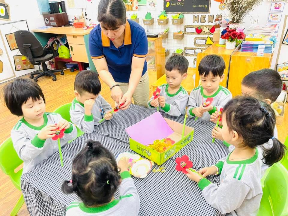 Những bàn tay bé xíu, khéo léo gấp – dán từng tấm giấy bìa màu để tạo thành những bông hoa rực rỡ 🌈🌼.