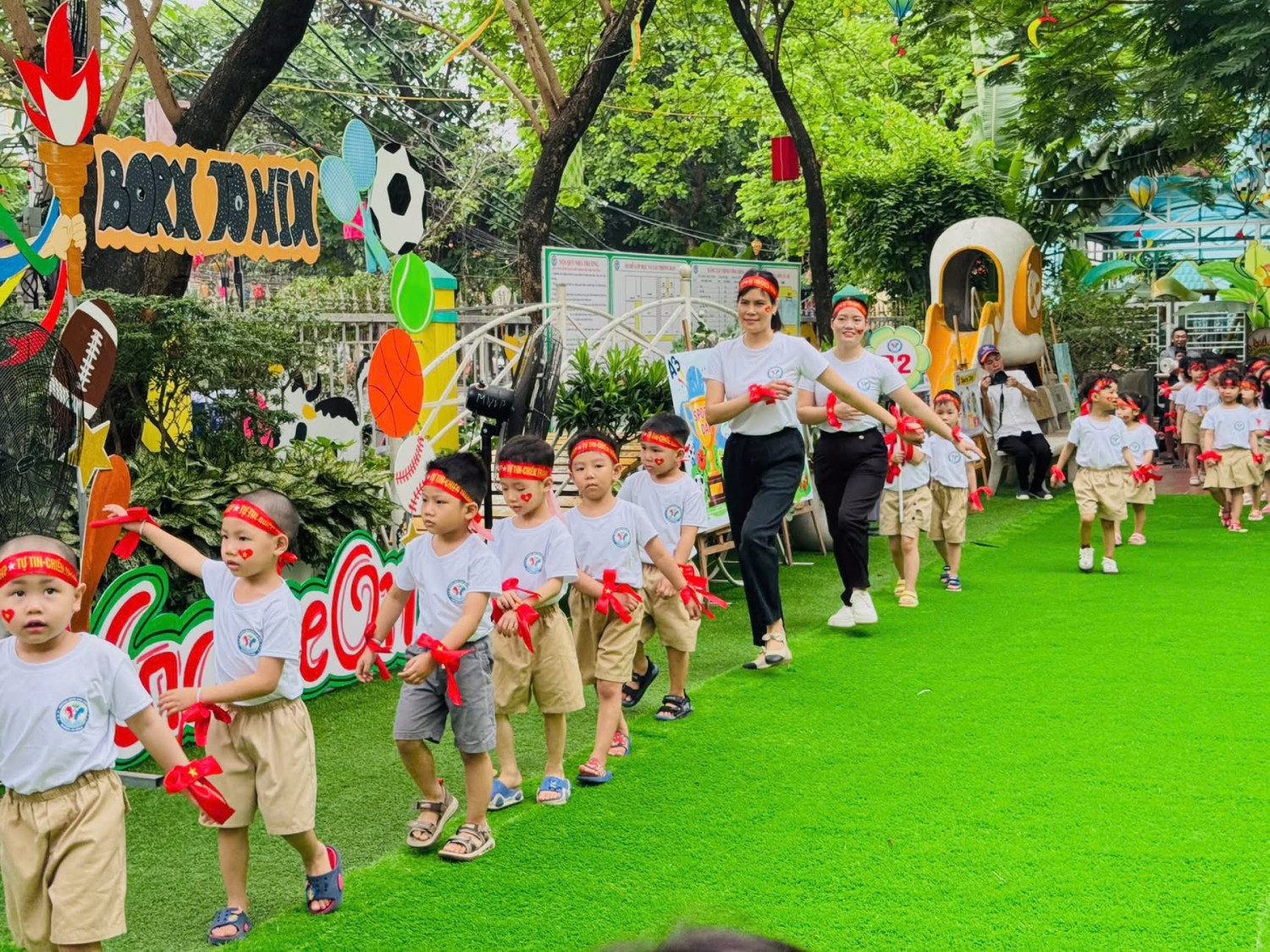 🇻🇳 Mở đầu là màn diễu hành đầy trang nghiêm và tự hào – các bé tay cầm cờ Tổ quốc, rước ảnh Bác, cờ thể thao, cờ chuối… sải bước hồn nhiên nhưng đầy khí thế, mang theo những khẩu hiệu ngộ nghĩnh mà ý nghĩa.
