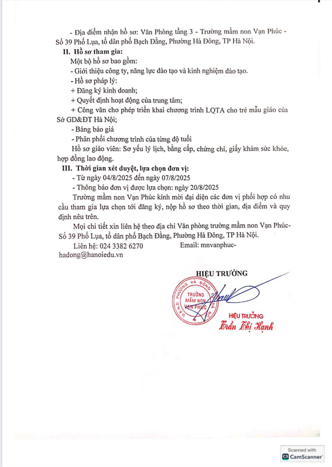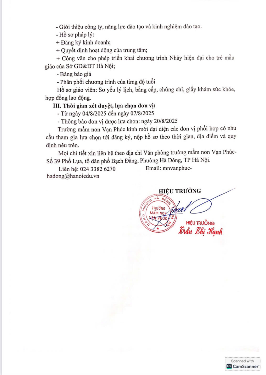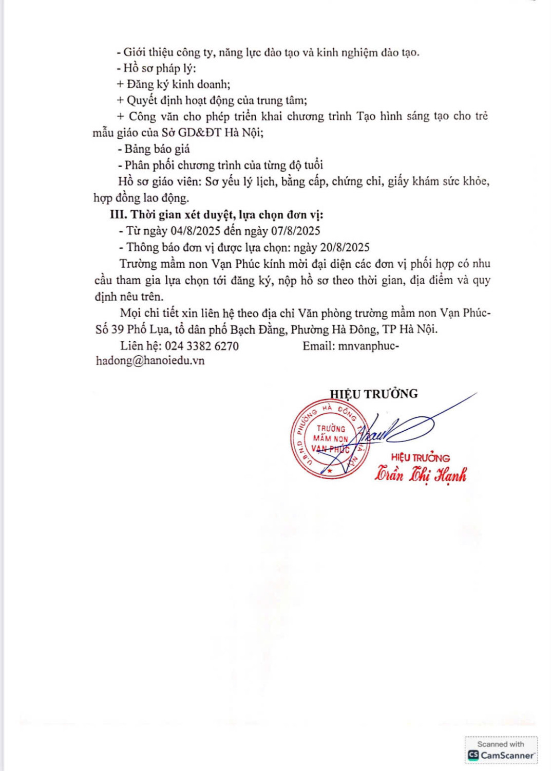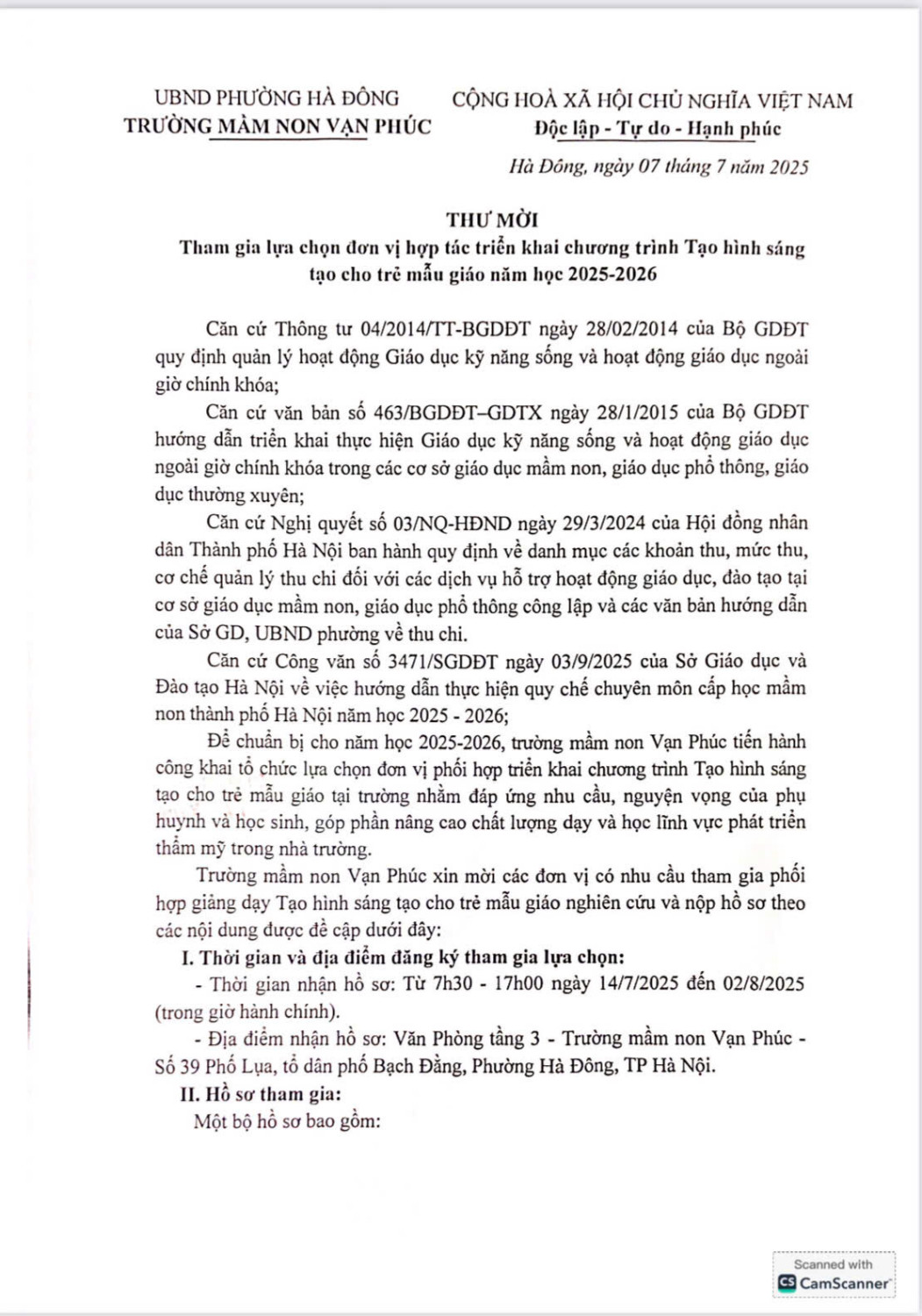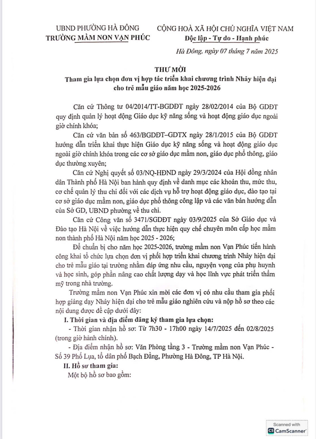 Trường Mầm non Vạn Phúc trân trọng kính gửi thư mời tham gia lựa chọn đơn vị hợp tác triển khai chương trình học các môn năng khiếu: Tiếng Anh, Tạo hình sáng tạo, Nhảy hiện đại
