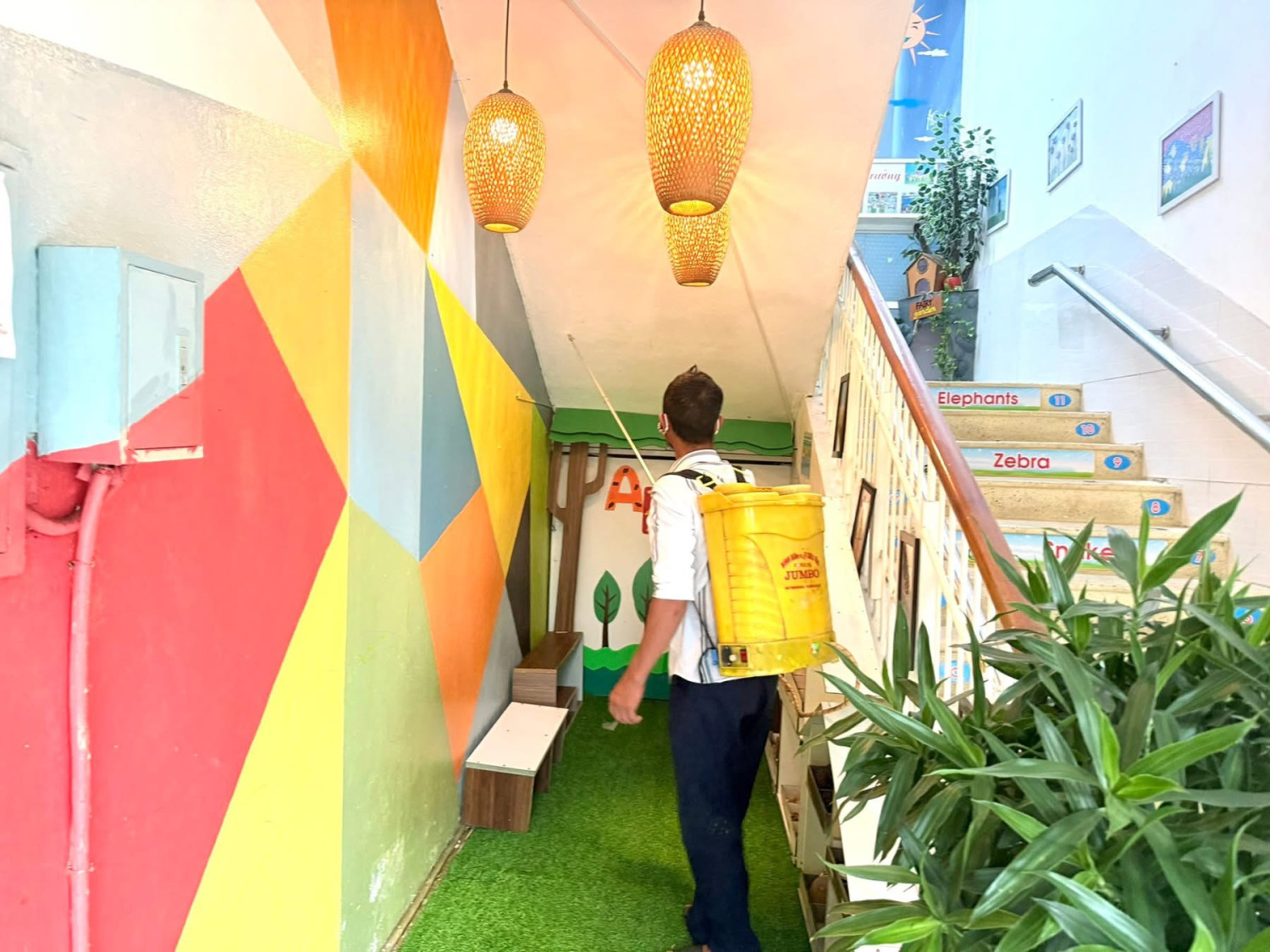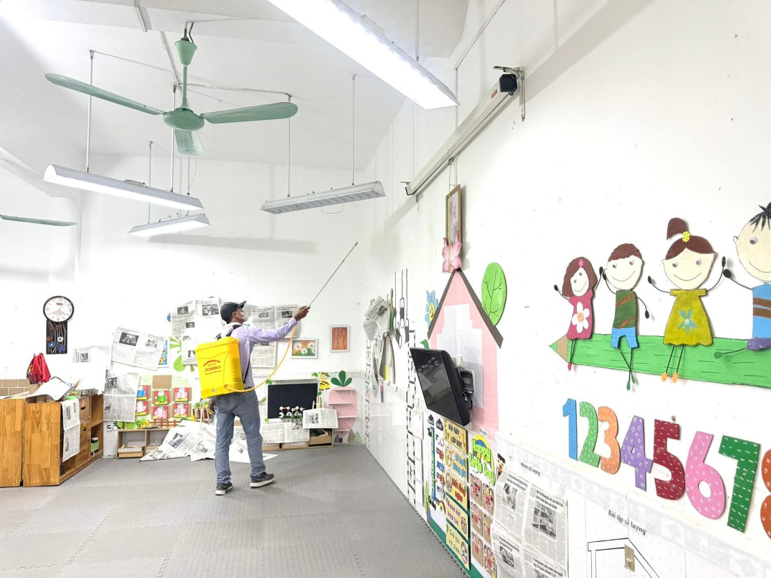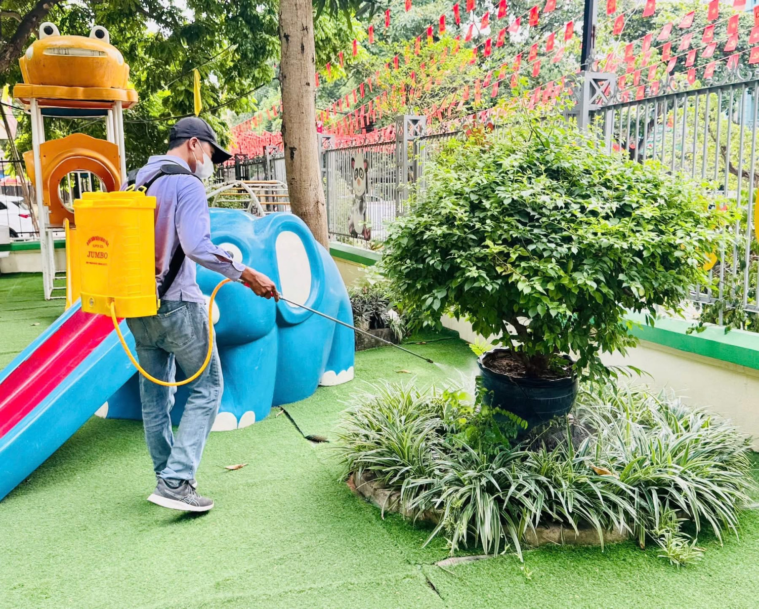 📸 Dưới đây là một số hình ảnh ghi lại quá trình phun muỗi tại các khu vực lớp học, sân chơi, hành lang, nhà vệ sinh và khu vực xung quanh trường.