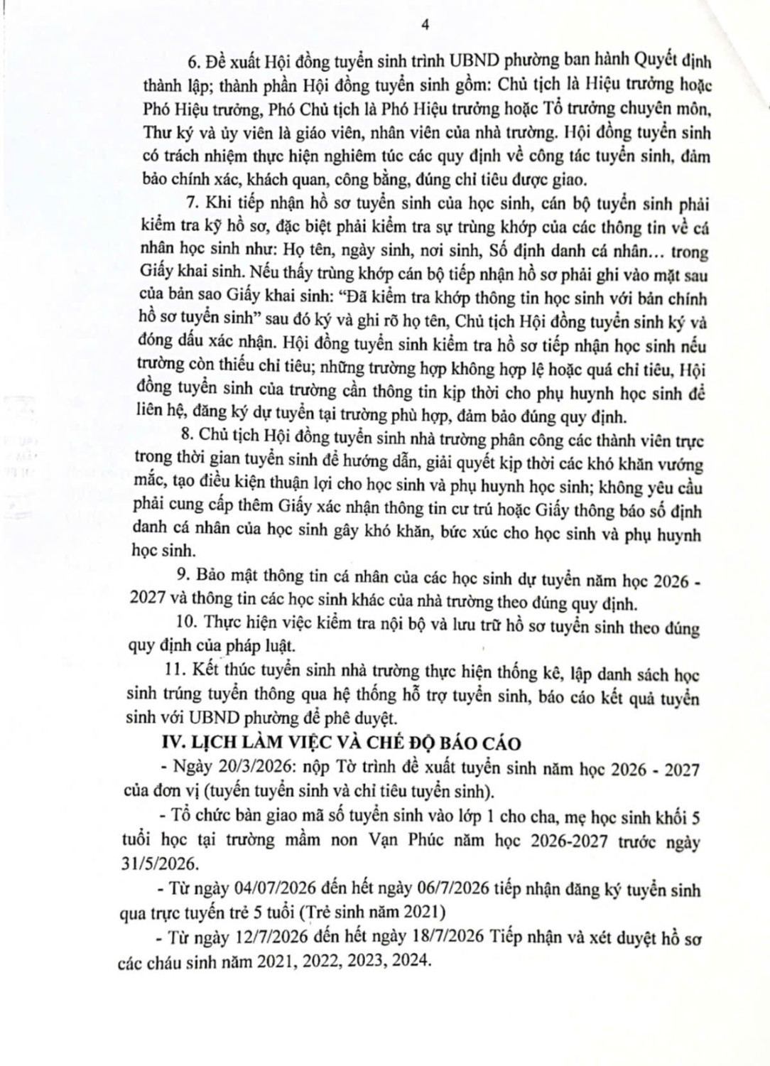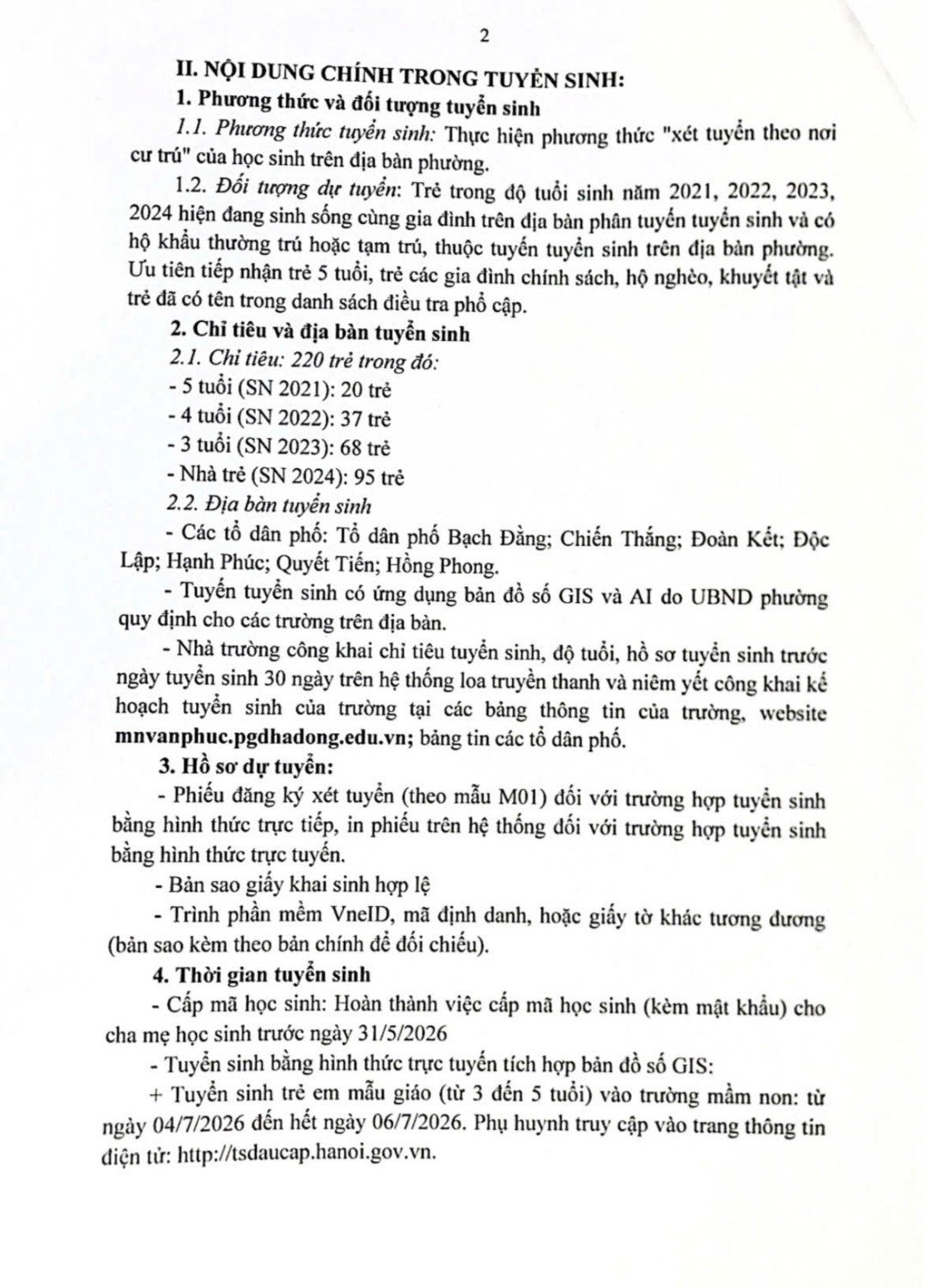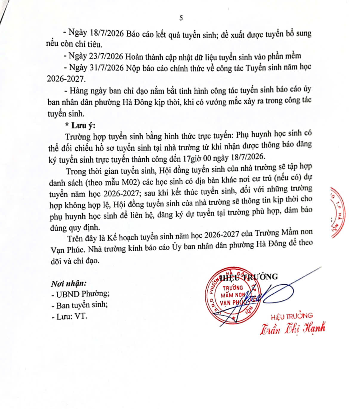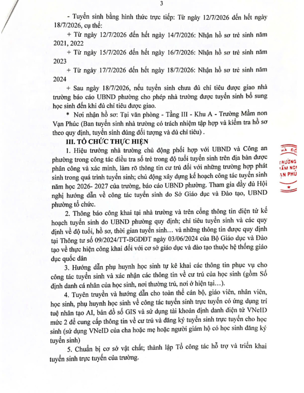TRƯỜNG MẦM NON VẠN PHÚC THÔNG BÁO KẾ HOẠCH TUYỂN SINH NĂM HỌC 2026-2027