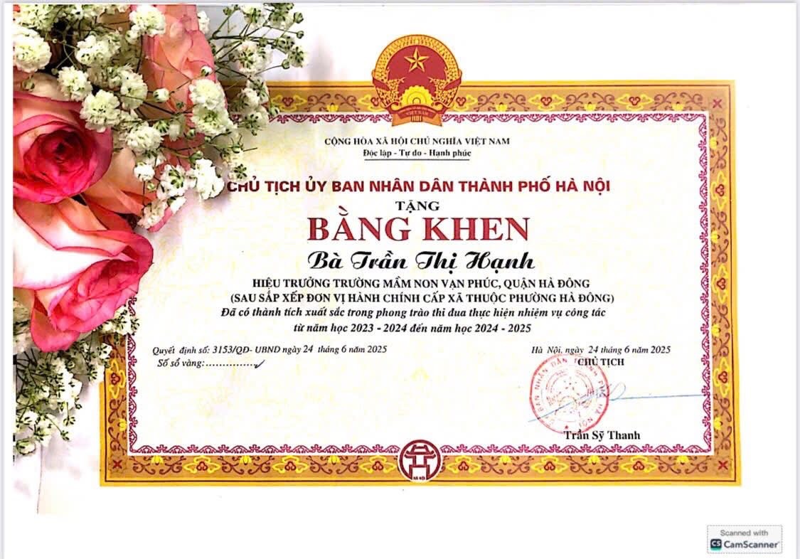 👩💼 Đồng chí Trần Thị Hạnh – Bí thư Chi bộ, Hiệu trưởng được Chủ tịch UBND Thành phố Hà Nội tặng Bằng khen.